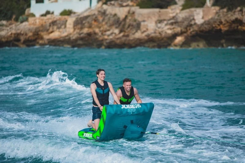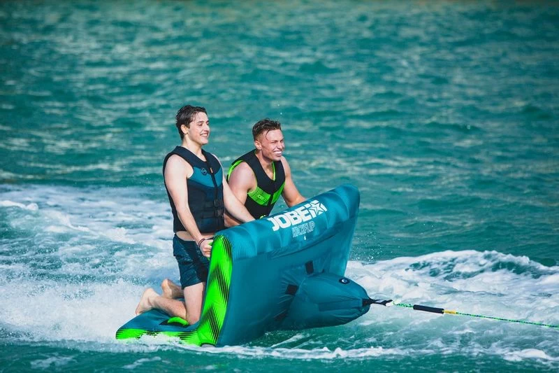 De Jobe Kick Flip is een funtube geschikt voor 2 personen. Zo kun je dus gezellig met vrienden of familie genieten van een dagje op het water. De funtube is voorzien van 8 handvaten zodat je er niet zomaar vanaf kunt vallen. Deze handvaten zijn voorzien van neopreen knokkel bescherming waardoor je geen last van je handen zult krijgen. Omdat de Jobe Kick Flip Funtube voorzien is van 2 trekpunten kun je zelf bepalen of je een wilde rit op het water wil of juist wil relaxen. Wanneer je het touw aan de voorkant gebruikt kun je de funtube als een soort sofa gebruiken en dus relaxen. Wanneer je het touw aan de achterkant gebruikt ga je dus voor de wildere ritten. Bepaal dus zelf waar je zin in hebt en geniet van een heerlijk dagje weg op het water.